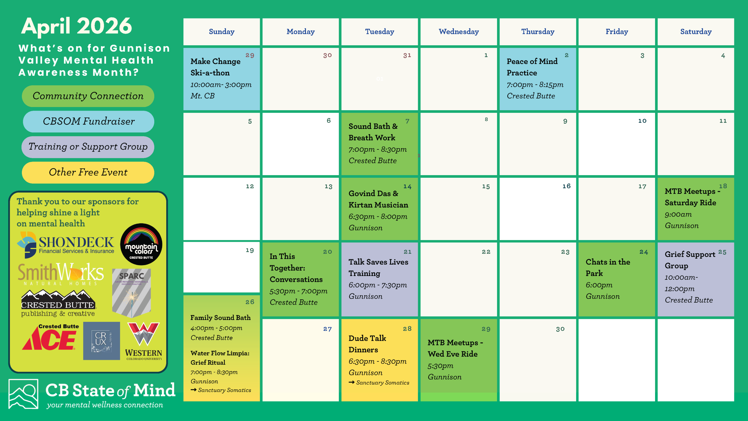 CB State of Mind is launching its 6th Annual Green Light Campaign and Gunnison Valley Mental Health Awareness Month to reduce the stigma and raise awareness about mental health throughout the Gunnison Valley. Events will start in late March and continue through April. Green is the recognized color for mental health awareness which signifies new life, new growth and new beginnings. We want those in need to know it’s okay to not be okay and that CB State of Mind and the local community are supportive of them.